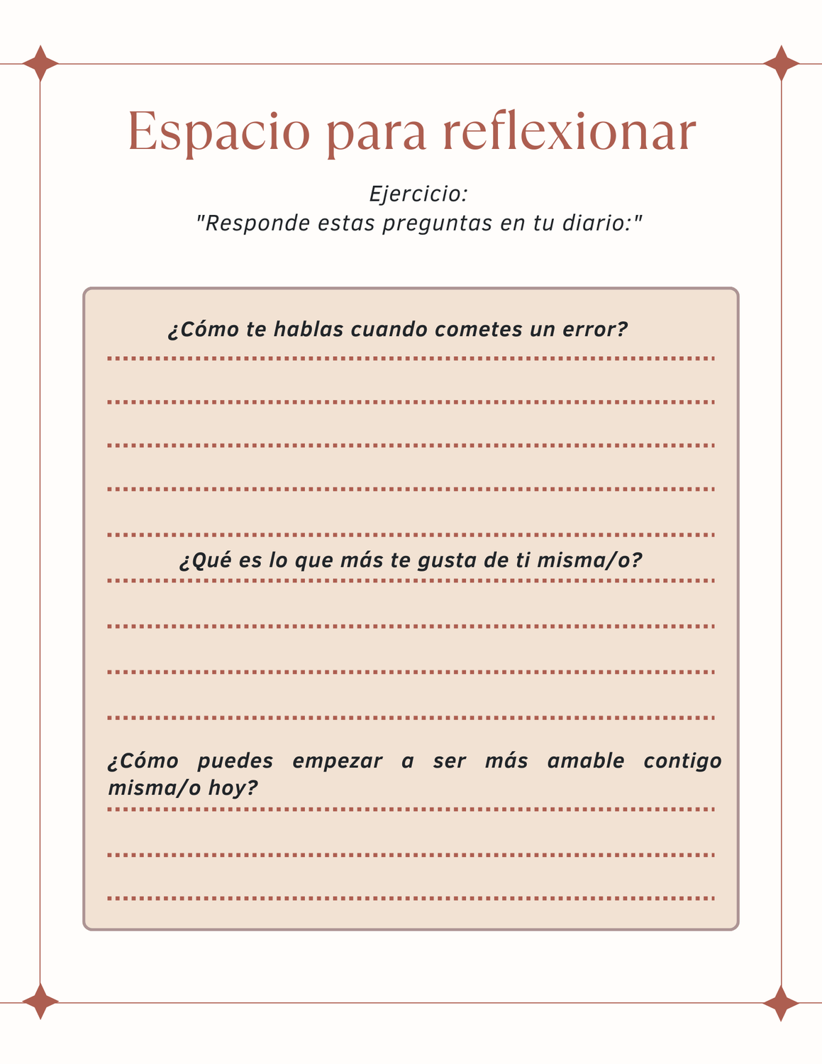 No pasa nada. Este diario no es una carrera ni un compromiso rígido. Puedes avanzar a tu ritmo, retomarlo cuando lo necesites y repetir las secciones que más te sirvan. Lo importante es que sea un espacio de autocuidado, no de exigencia.